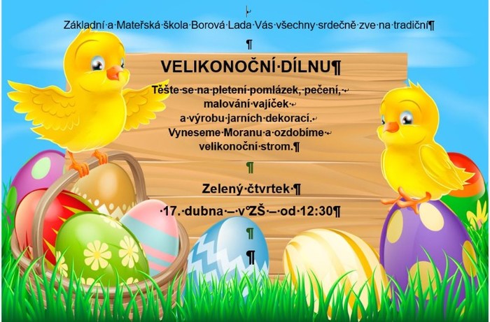 Zveme vás do ZŠ na tradiční velikonoční dílnu s vynášením Morany a zdobení velikonočního stromu u obecního úřadu. Přijďte ve 12.30 hod. v "zeleném", přineste si vyfouknutá vajíčka, přezůvky a kluci řehtačky.